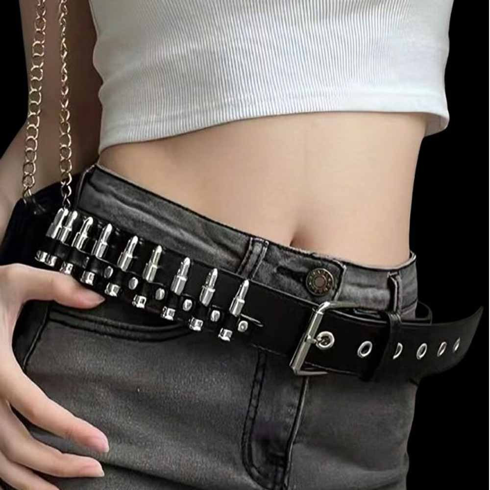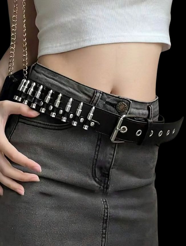 The standout feature is the sleek, stainless steel buckle, measuring 7 cm by 3 cm, perfectly complementing the 3 cm wide belt strap. This belt is not just an accessory; it’s a statement piece. Whether you’re heading to a casual hangout or a night out, the Y2K Bullet Belt adds that unique, finishing touch. Its classic black color ensures it pairs seamlessly with a variety of outfits.